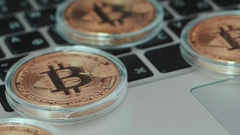 bitcoin på tangentbord. bitcoin valuta med blockchain begrepp på bärbar dator tangentbord med mynt och diagram och grafer. stock. crypto investering säkerhet och strategi. Pro Video