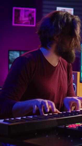 vertikal video musik producent spelar hans låt på piano tangentbord och sång på mikrofon, inspelning ljudspår till redigera på blandning trösta. kompositör arbetssätt med synthesizer i Hem studio. kamera b. Pro Video