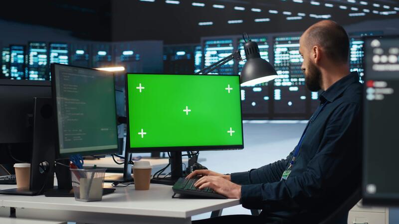 man skriver koda på grön skärm dator i hög tech data Centrum med server rader tillhandahålla datoranvändning Resurser. den specialist använder sig av attrapp pc till övervaka rackmontering rörelse data Pro Video