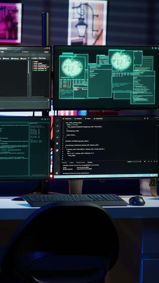 vertikal manus löpning på dator i hemlighet bas av operationer Begagnade förbi hacker till stjäla data. programmering språk på skärm i tömma rum Begagnade förbi cyberbrottsling, attackera brandväggar Pro Video