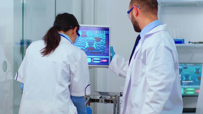 forskare team argumenterar i främre av dator ser på virus utveckling i modern utrustad laboratorium. multietnisk grejer analyserar vaccin Evolution använder sig av hög tech för forska behandling. Pro Video