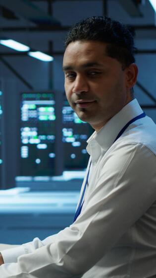 vertikal porträtt av optimistisk administration i data Centrum hantera servrar, rörelse system och programvara program. glad specialist i server nav säkerställa nät är säkra och fungerar ordentligt, kamera en Pro Video