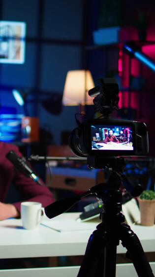 vertikal innehåll skapare värd uppkopplad visa i rgb lampor studio, skytte vlog använder sig av professionell redskap. vlogger presenter information under strömning service utsända filmad med kamera, kamera b Pro Video