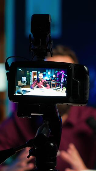 vertikal innehåll skapare värd uppkopplad visa i rgb lampor studio, skytte vlog använder sig av professionell redskap. vlogger presenter information under strömning service utsända filmad med kamera, kamera en Pro Video