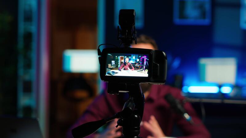 innehåll skapare värd uppkopplad visa i rgb lampor studio, skytte vlog använder sig av professionell redskap. vlogger presenter information under strömning service utsända filmad med kamera, kamera en Pro Video