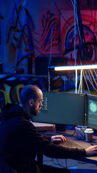 vertikal hacker i underjordisk lager skrivning rader av koda på dator skärm till göra skadliga program den där skaffa sig över säkerhet system. man i dold hq byggnad skript den där kan hacka enheter, dolly i skott Pro Video
