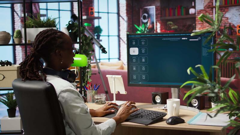 kvinna använder sig av ai program vändning text prompt in i videoklipp, nöjd förbi resultat. person omgiven förbi växter interagera med text till artificiell intelligens generativ modell, kamera en Pro Video