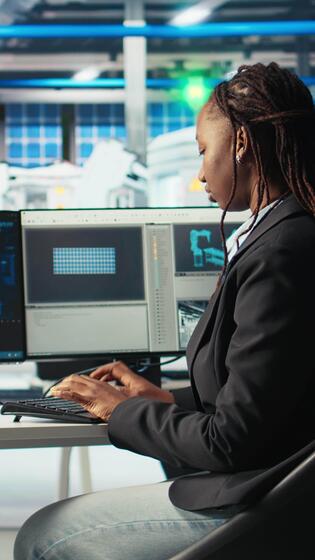 vertikal systemet administratör i solceller fabrik använder sig av ai till diagnostisera ofungerande system. sol- paneler tillverkning växt programvara utvecklare minska driftstopp använder sig av artificiell intelligens, kamera en Pro Video