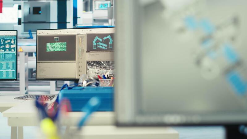 cad program på pc skärm i solceller fabrik Begagnade för design produktion rader för sol- panel hopsättning anläggningen. simulering programvara på dator övervaka i tömma sol- paneler växt Pro Video