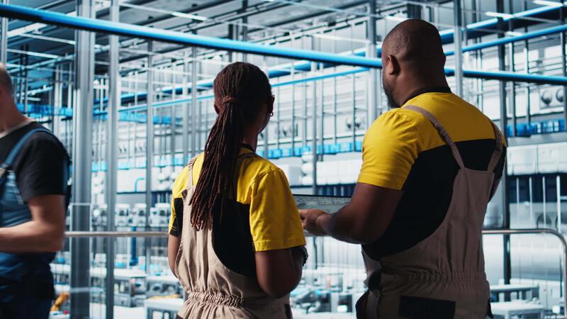 lagarbete smart fabrik kollegor håller på med brainstorming, programmering automatisering Utrustning. industri 4.0 växt anställda arbetssätt tillsammans till design robot maskiner använder sig av cad programvara, kamera en Pro Video