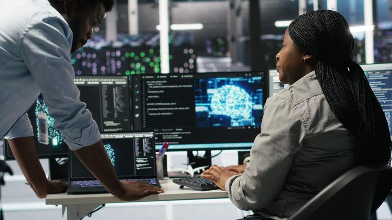 data Centrum teknik team användningar artificiell intelligens djup inlärning modeller till configure redskap. lagarbete kollegor arbete på ai programmering språk i server odla, optimerande systemet, kamera b Pro Video