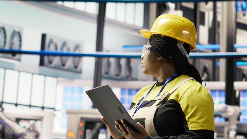 leende ingenjör i smart fabrik utför prediktiv underhåll använder sig av läsplatta, analyserar iot sensor data. industriell växt arbetstagare hantera operativ pålitlighet av solceller system, kamera b Pro Video