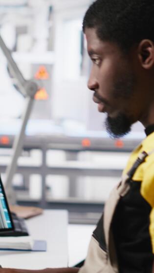 vertikal svart arbetstagare programmering robot hopsättning linje i sol- cell fabrik, arbetssätt med hög tech programvara för automatisering. manlig ingenjör testning solceller systemet, maskineri. kamera a. Pro Video
