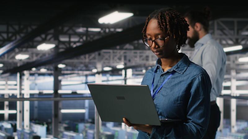 porträtt av glad dator forskare i data Centrum övervakning neuralt nätverk llm visualisering. optimistisk kvinna i server bruka övervaka riggar driver maskin inlärning processer, kamera b Pro Video