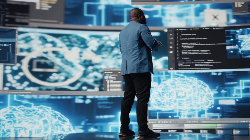 i en trogen digital arbetsyta, svart utvecklare programmering programvara och utforskar koda utdrag. tech professionell förkroppsligar innovation, Cybersäkerhet, automatisering och utveckling. kamera a. Pro Video