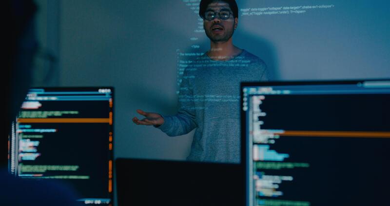 grupp vuxen Asien manlig programvara utvecklare mentor ledare chef prata strategi planen till verkställande skriva prompt ai bot den app program nomad, spel, designer, data Centrum. Pro Video