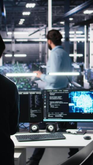 vertikal programmerare som förs in i server rum kontor, använder sig av ai till recension infrastruktur diagnostik. den administration i data Centrum hög tech anläggning analyser prestanda data använder sig av artificiell intelligens teknik, kamera en Pro Video