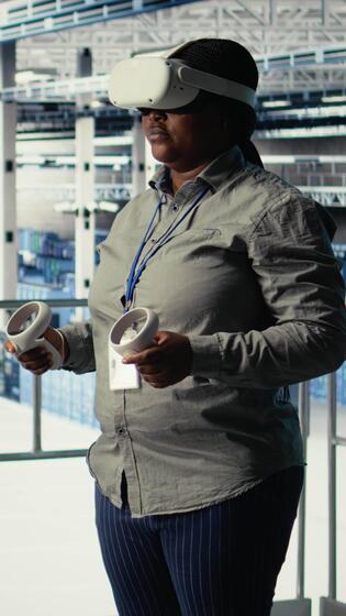 vertikal data Centrum den expert- undersöker ai konfigurationer använder sig av virtuell verklighet, framställning justeringar för optimal fungera. server nav ingenjör checkar artificiell intelligens fel använder sig av vr headset, kamera en Pro Video